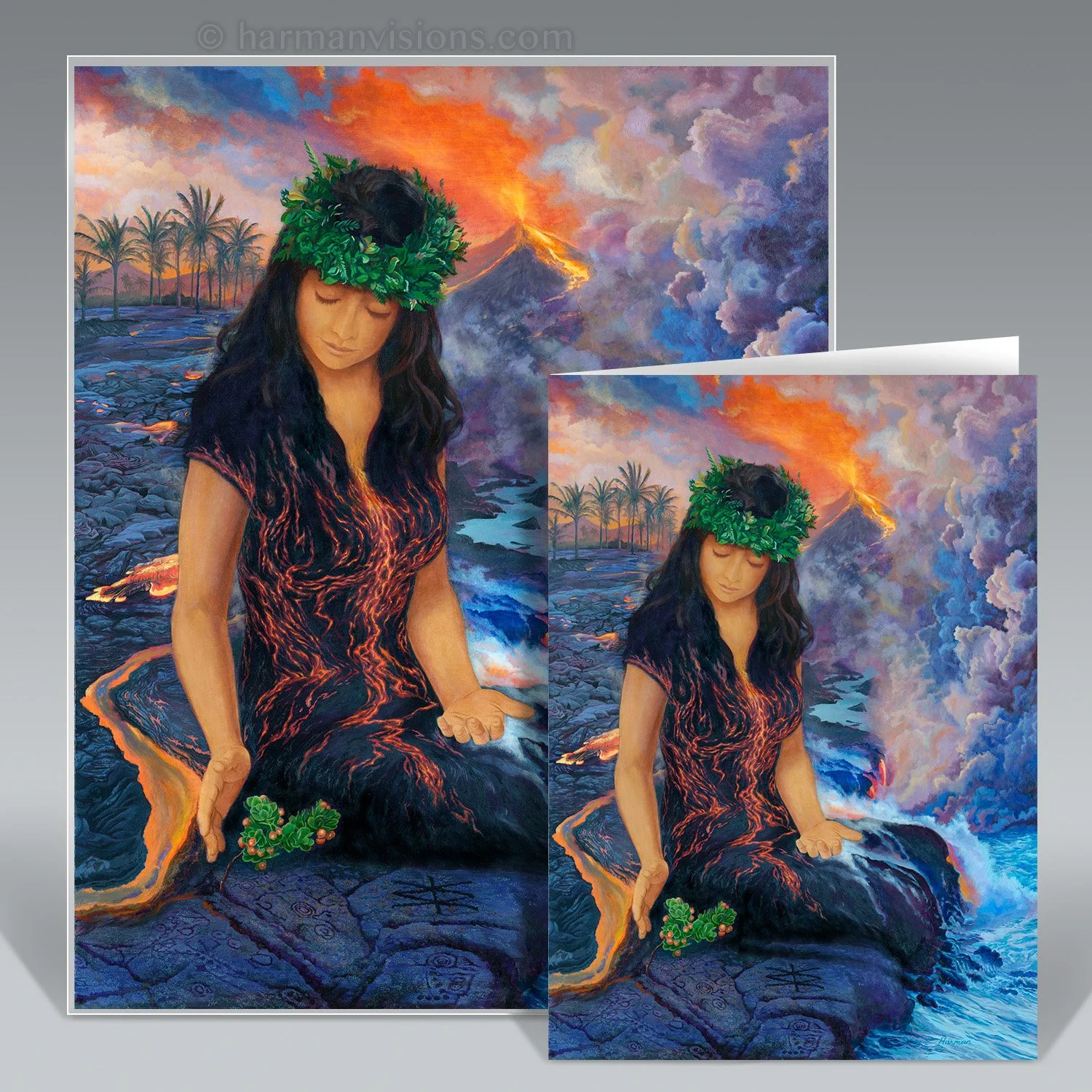 Before the (violent) ali'is from Tahiti came and took over, Hawai'i's culture was matrifocal, peaceful and abundant. This is what our ancestors are calling us to reclaim - for all people. We need to be reminded of how we can all live together in peace and plenty. This painting of Pele aims to depict the power, beauty, grace and endless generosity of the Goddess.